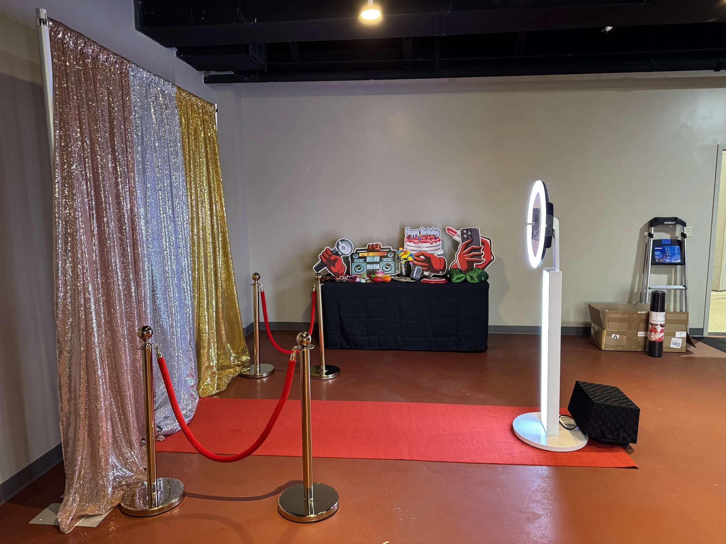 Includes: LED light enclosure, professional lighting, extensive props collection, on-site attendant, instant sharing via text/email/social media.